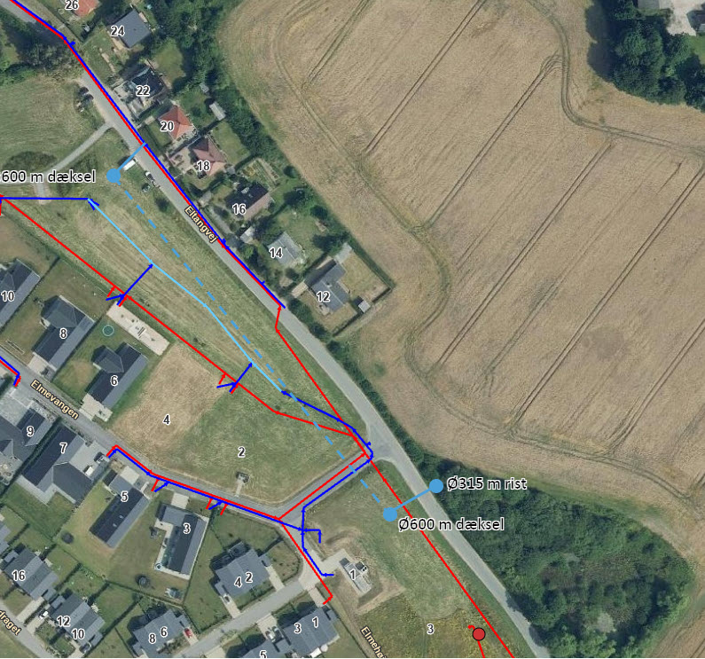 Dette drænsystem blev berørt da et stykke rørplastik satte sig fast og dannede prop i et rør- og drønsystem langs Eltangvej nær Elmevangen og Elmedraget. Kort: Kolding Kommunes Entreprenørafdeling.