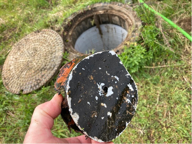 Et stykke rørplastik, der satte sig fast og dannede prop i en brønd.